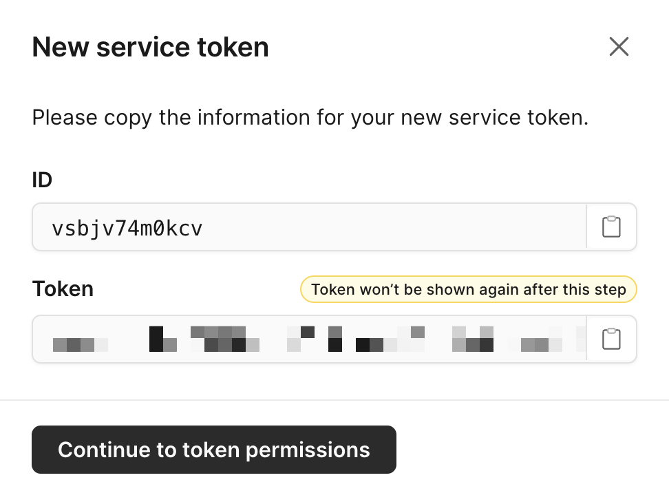 Modal showing service token ID and token secret